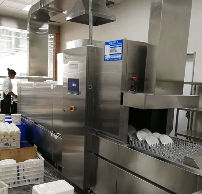 首款長龍洗碗機,適用于加工廠、高校、員工食堂等用餐總量較大的場所。它的長度從4米到10米不等,有單個清洗設備和清洗風干機兩種,價格從幾萬塊不等。比如有的客戶會集成超聲波池使用。廚具經超聲波池清洗后,大部分油漬和沉淀物會脫離爆炸。然后將廚具放入水槽洗碗機中進行高壓自噴、高溫風干消毒殺菌,達到理想的清洗效果。在對廚具衛生要求較高的餐廳、酒店、餐廳等場所使用洗碗機,是一種理性的選擇。