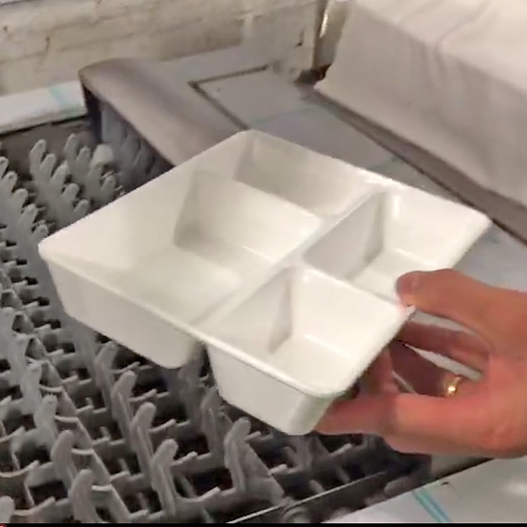 2.擺設餐具:將餐具碗口朝下放置在傳送帶上,注意不要重疊餐具,擠壓排出物,這樣可避免在機洗過程中發(fā)生洗碗不干凈或餐具損壞現象。